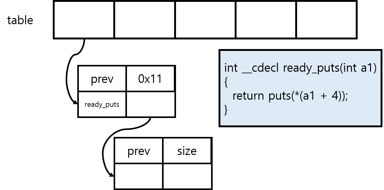 (*table[v1])(table[v1]);부분을 이용하여 system함수를 호출한다.- ready_puts함수가 저장된 부분을 system함수로 overwrite 한다.