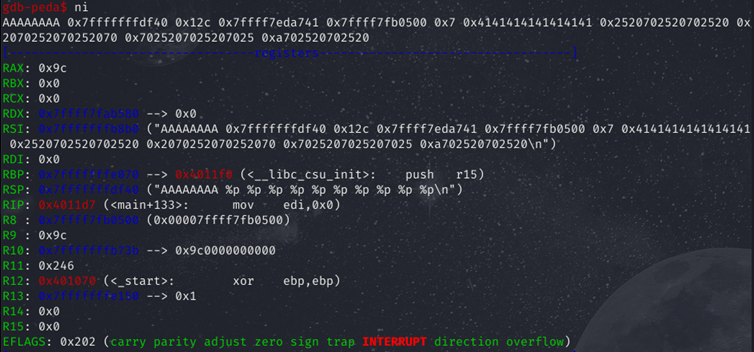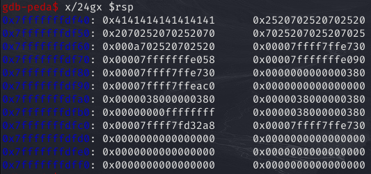 %p로 rsp(0x7fffffffdf40) 출력 이후 rsp+8, rsp+16 ... 출력된다.