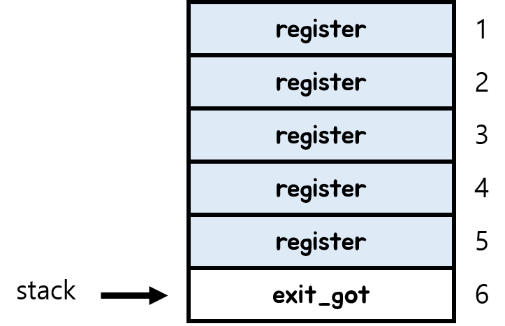 위와 같이 호출 전에는 총 3바이트만 바꾸어 주면 되지만 호출 후에는 총 6바이트를 바꾸어 주어야 하기 때문에 exit의 got를 이용하는 것이다.