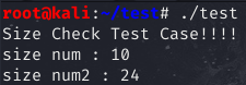 num에는 Size Check 총 10이 저장되었고 num2에는 Size Check Test Case!!!! 총 24가 저장되어 출력된 것을 확인할 수 있다.