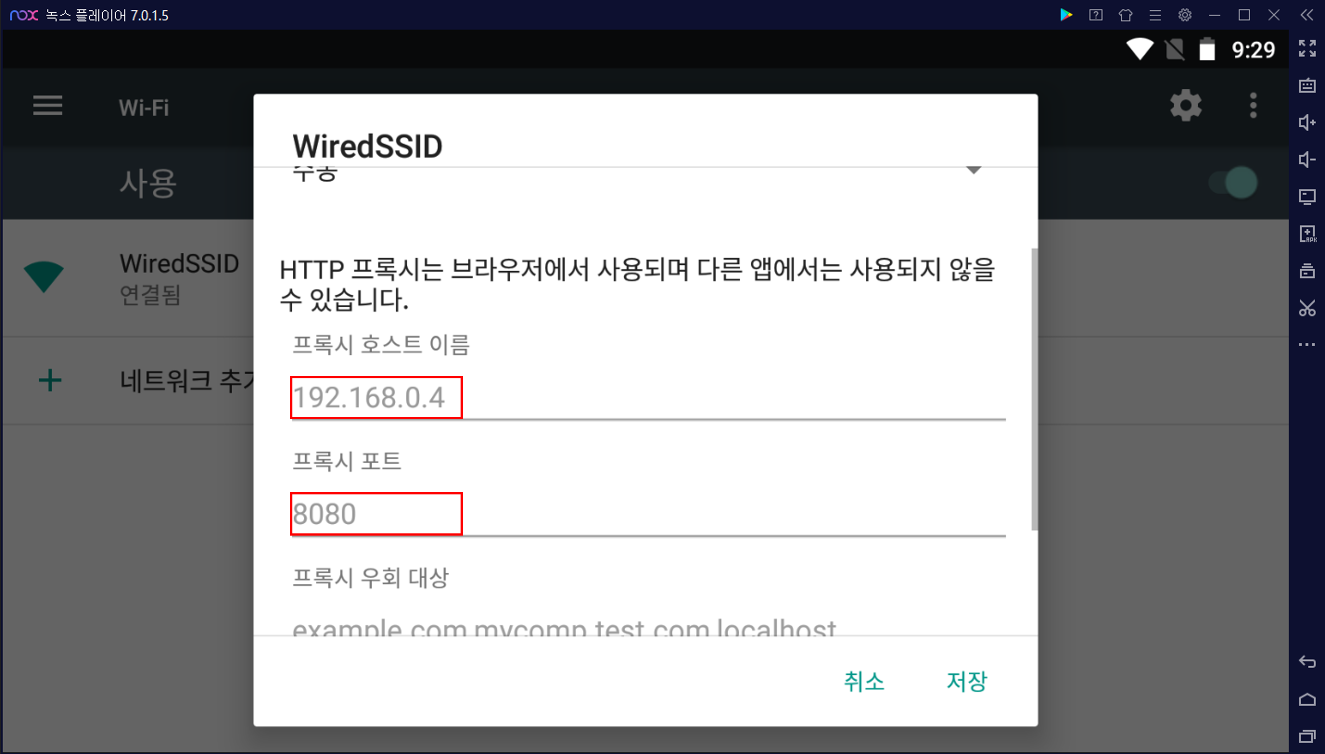 녹스에서 설정 → Wi-Fi → WiredSSID(연결된 Wi-Fi)에서 네트워크 수정을 눌러준 후 다음과 같이 호스트와 포트를 입력한다.