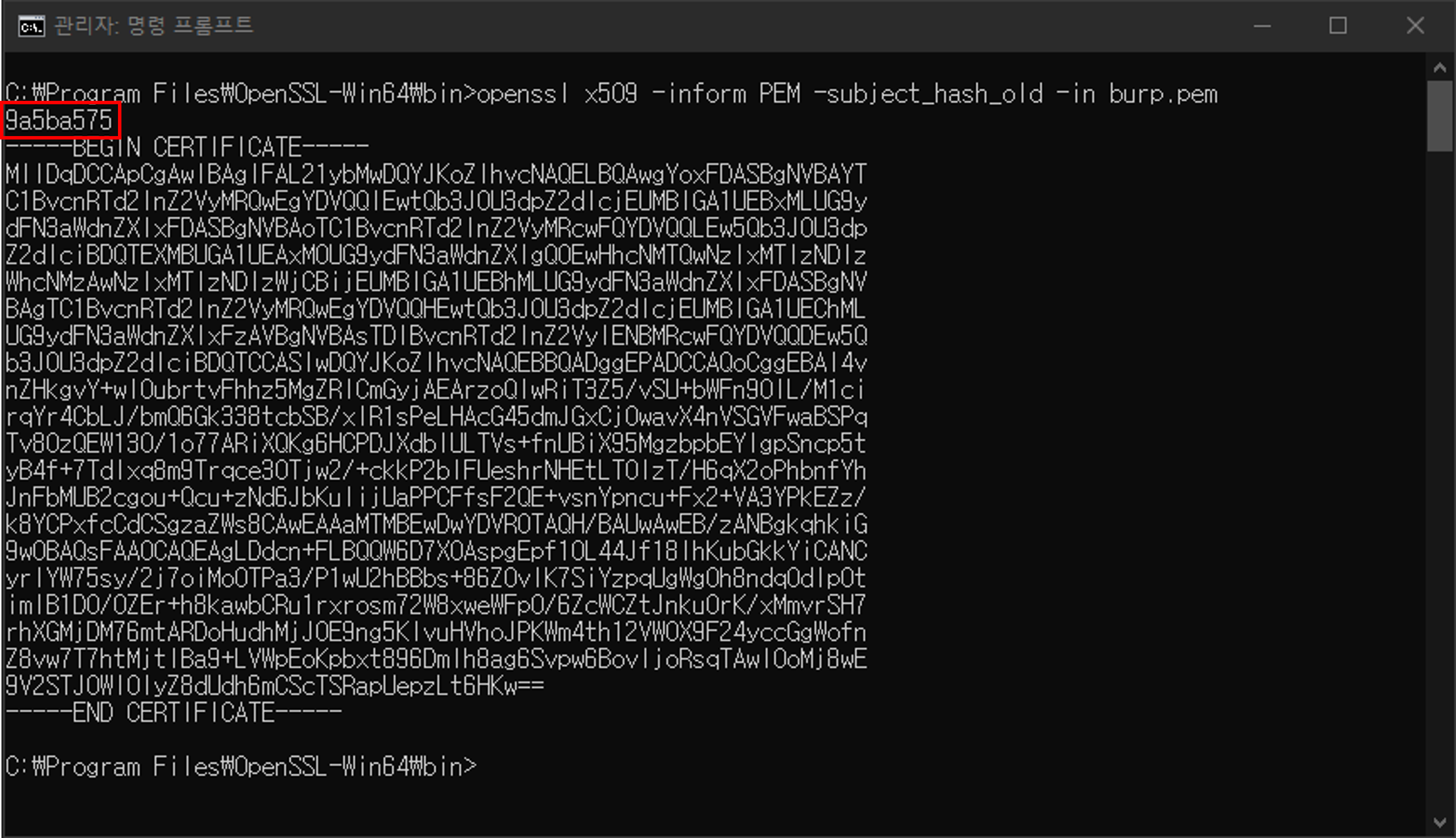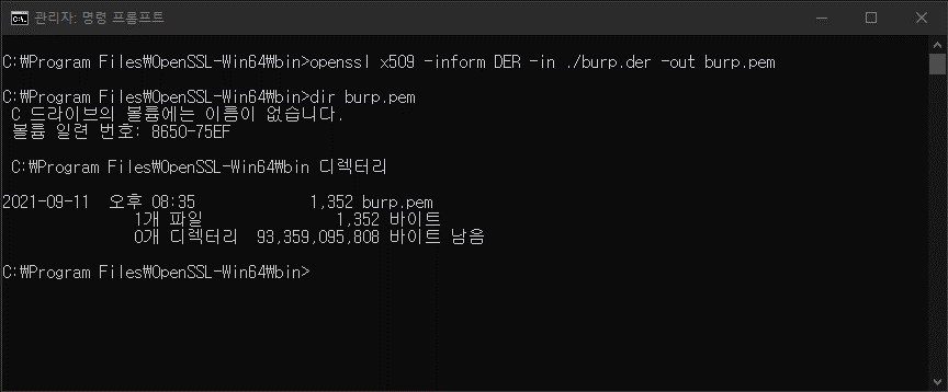 이후 다음 명령어를 통해 burp 인증서를 pem으로 변환해준다. (이때 관리자 권한이 필요하다)