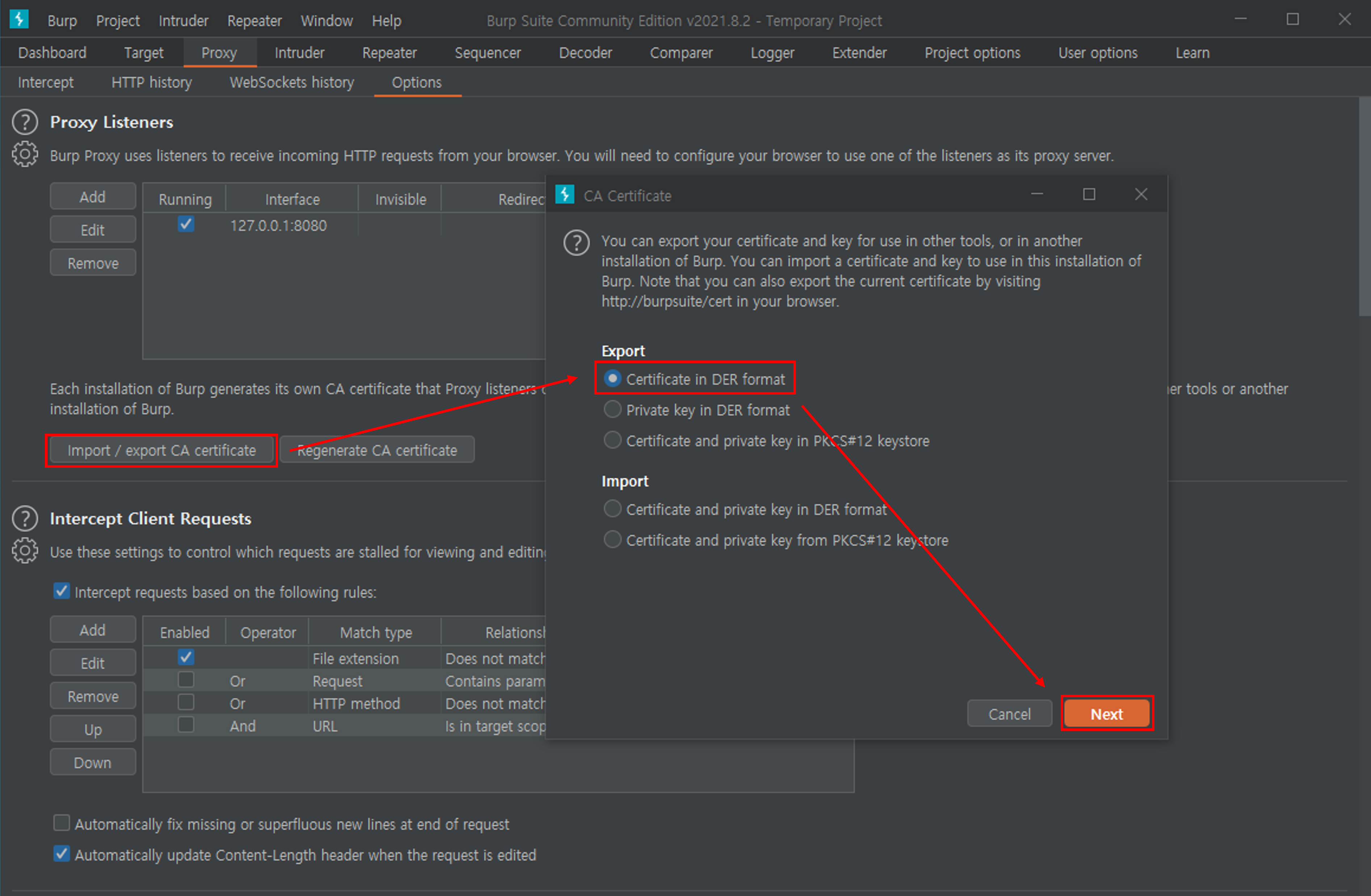 Burp Suite에서 Proxy → Options로 이동한 후 다음과 같은 순서로 인증서 추출을 진행한다.