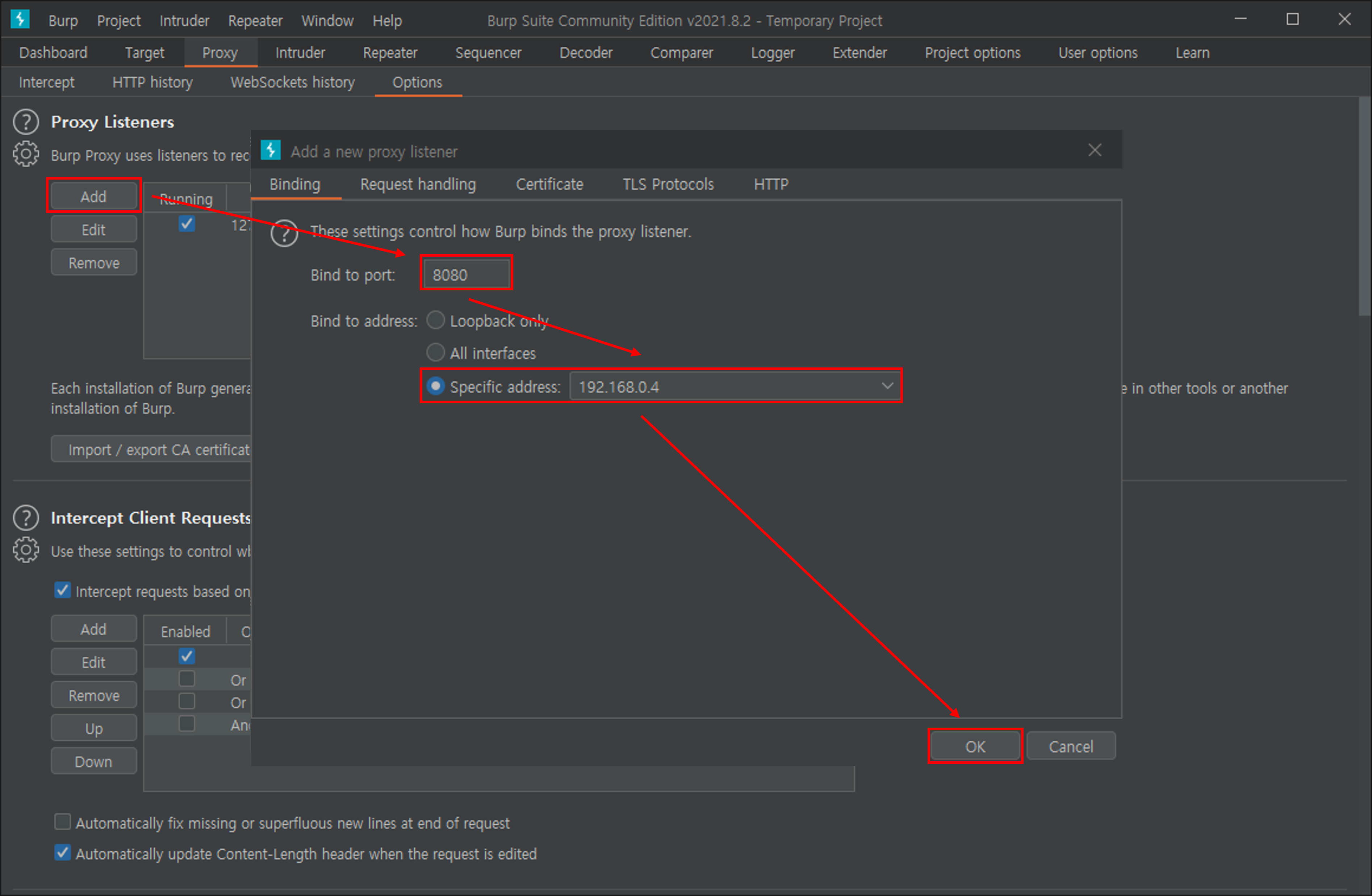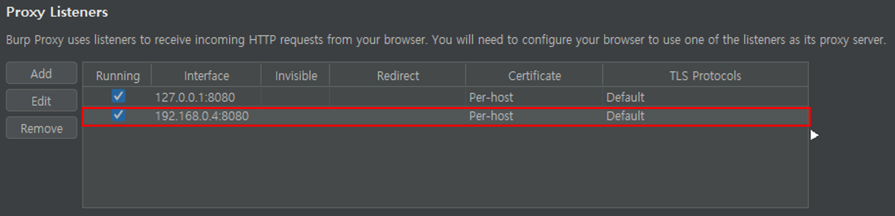 Burp Suite에서 Proxy → Options로 이동한 후 Proxy Listeners의 Add를 눌러 리스너를 추가한다.