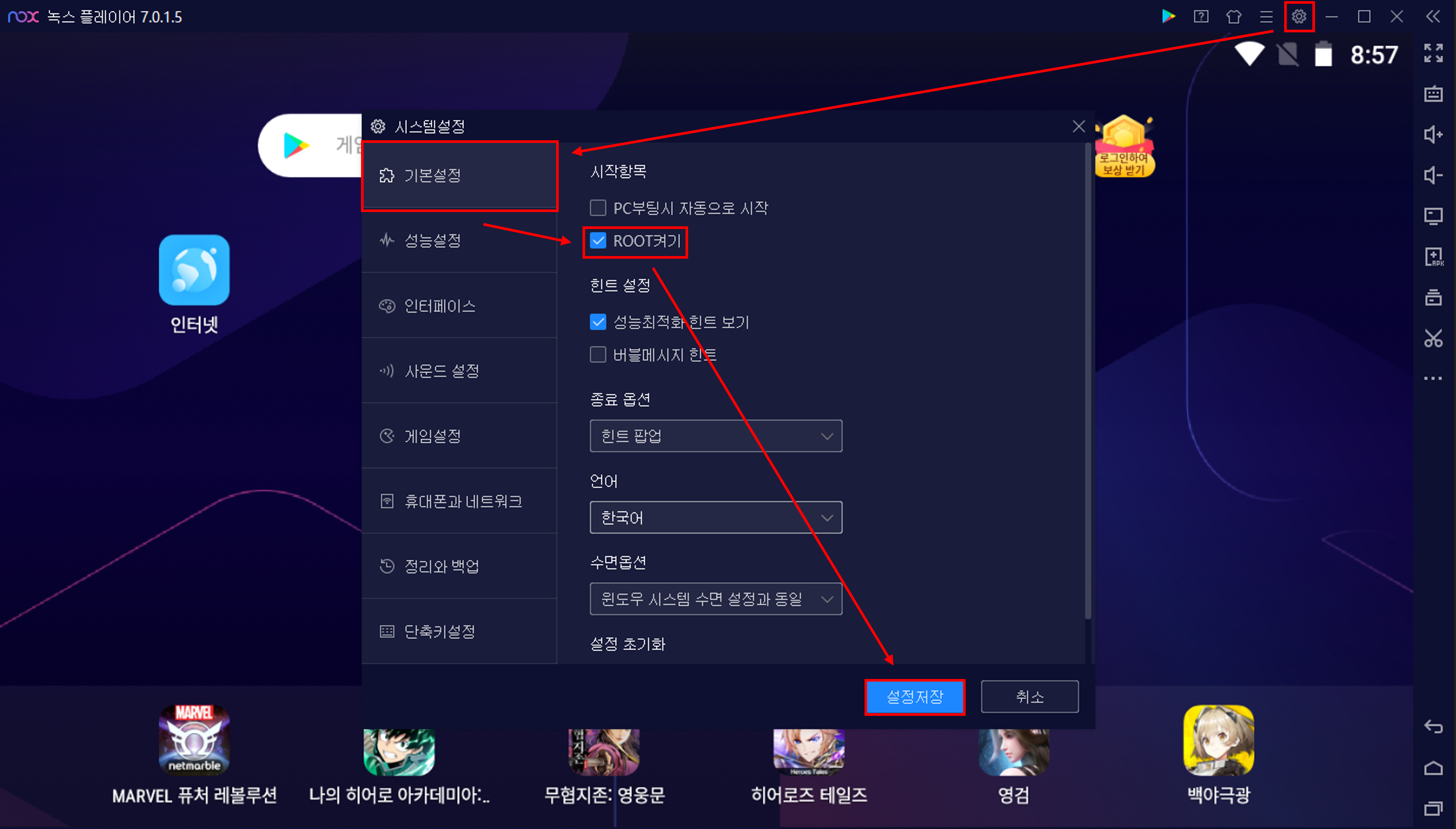 가장 먼저 Nox의 시스템설정 → 기본 설정 → ROOT 켜기를 통해 루팅을 활성화한다.