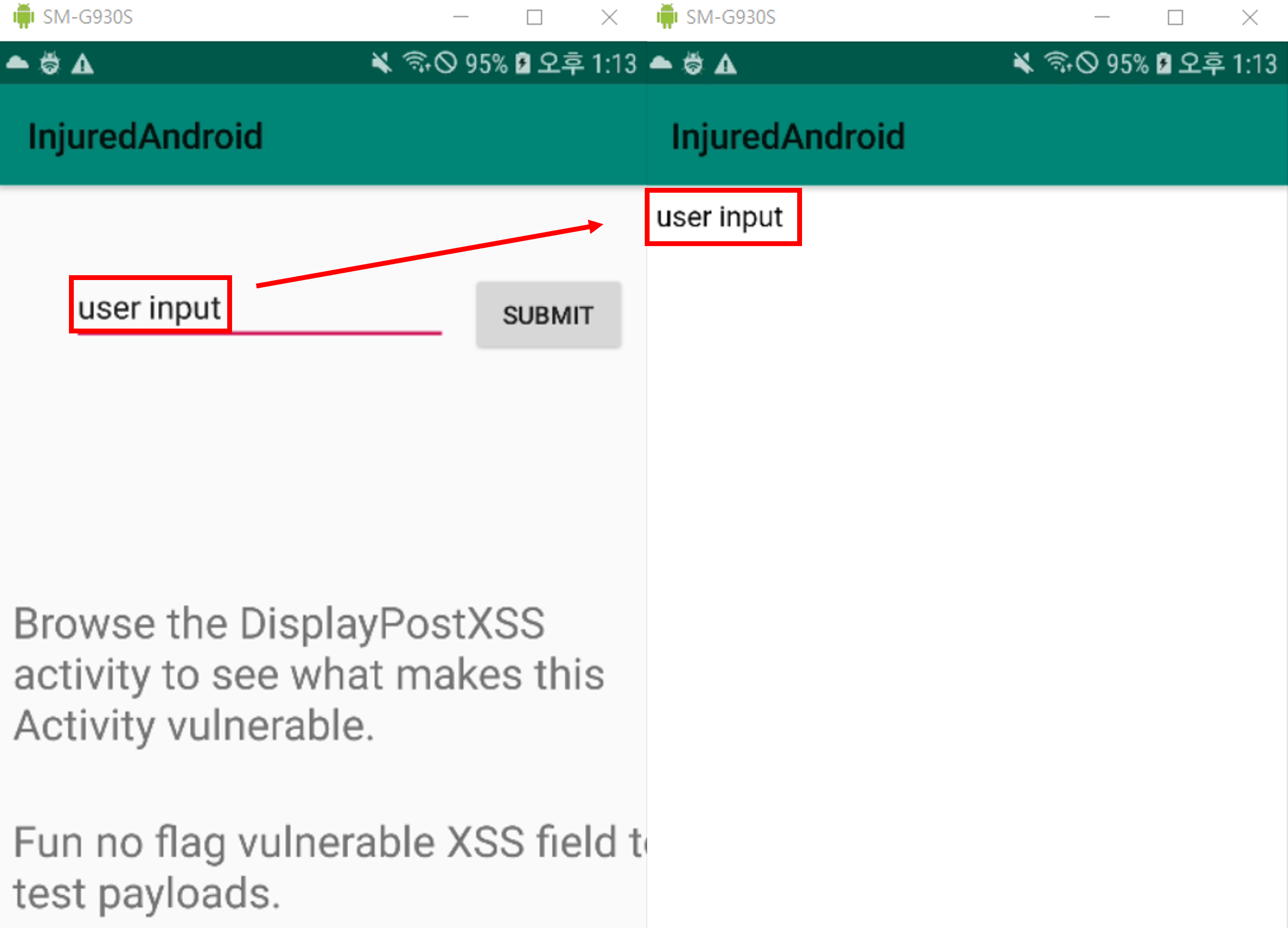 요약하자면 XSSTestActivity의 submitText()에서 사용자에게 입력받은 값을 String으로 변환 후 인텐트를 통해 DisplayPostXSS으로 넘겨주는데 이때 해당 값을 stringExtra 변수에 저장하게 된다.