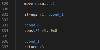 이전 코드 중 애뮬레이터가 맞다면 cond_0으로 이동하여 v3 값을 0x1로 설정해준 후 이를 반환해주는 것을 확인할 수 있다.