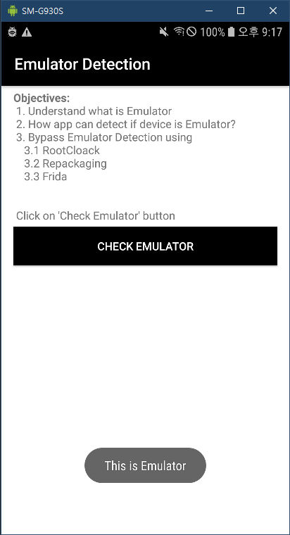 스크립트 실행 후 CHECK EMULATOR 버튼을 눌러주면 다음과 같은 로그와 이전 smali변조와 같이 "This is not Emulator"라는 메시지를 애플리케이션에서 확인할 수 있다.