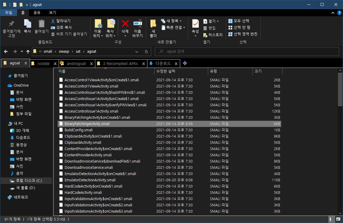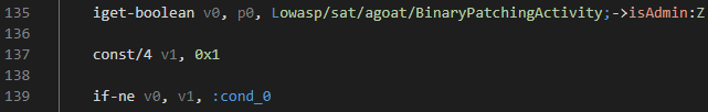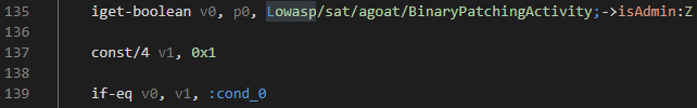 디컴파일 완료 후 smali → owasp → sat → goat 경로를 따라가면 BinaryPatchingActivity.smali 코드를 확인할 수 있다.