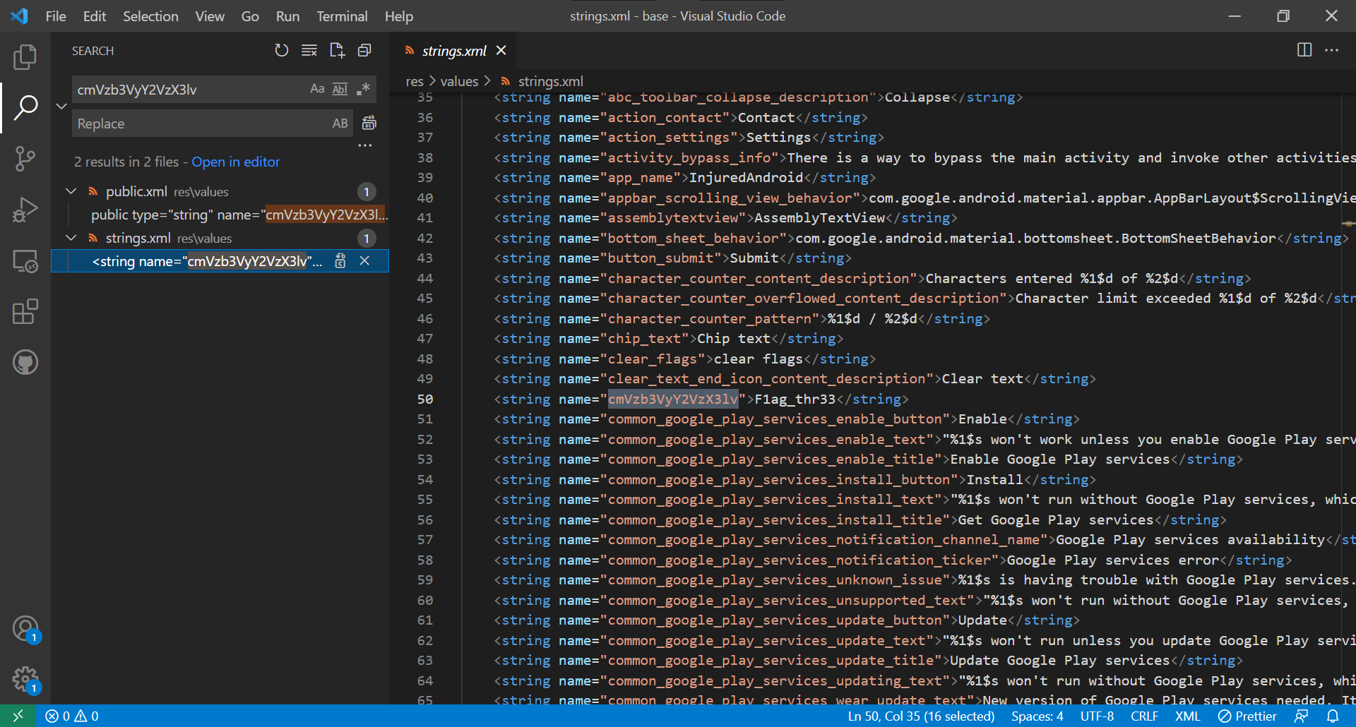 폴더를 불러온 후 Search(Ctrl + Shift + F)기능을 사용하여 "cmVzb3VyY2VzX3lv "를 검색하면 다음과 같이 플래그를 얻을 수 있다.