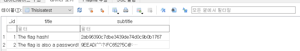 추출한 데이터 베이스 파일을 열어준 후 Thisistest 테이블을 확인하면 다음과 같이 값을 확인할 수 있다.