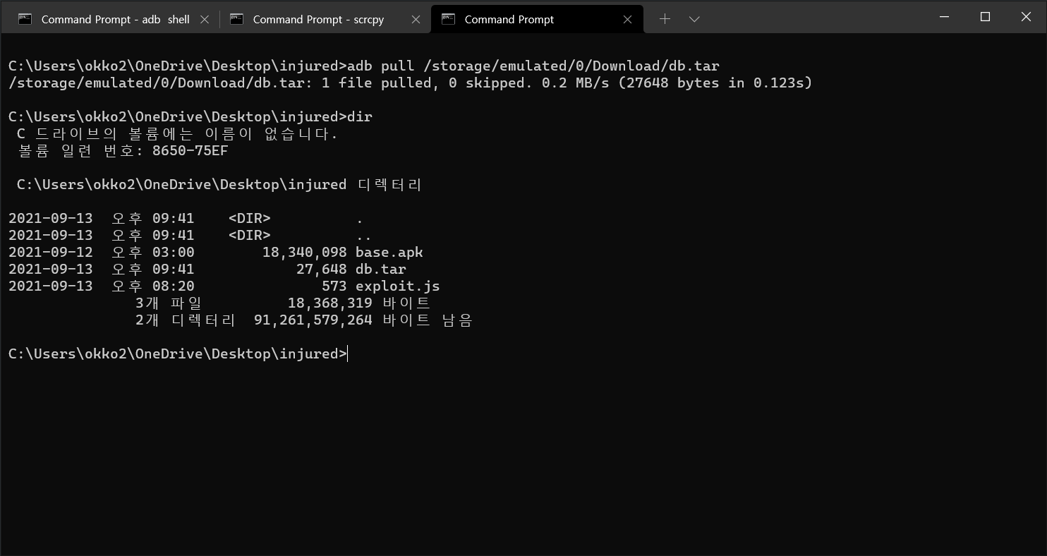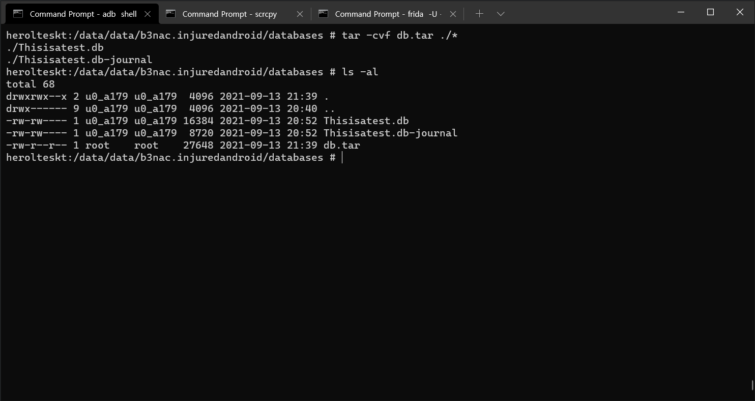 파일을 내보내기 위해 tar 명령어를 사용하여 db.tar로 만든 후 /storage/emulator/0/Download로 파일을 옮겨준다. (파일을 옮겨주는 이유는 adb pull로 파일을 가져올 때 기존 경로는 권한 문제로 가져올 수 없기 때문에 옮겨주는 것이다)