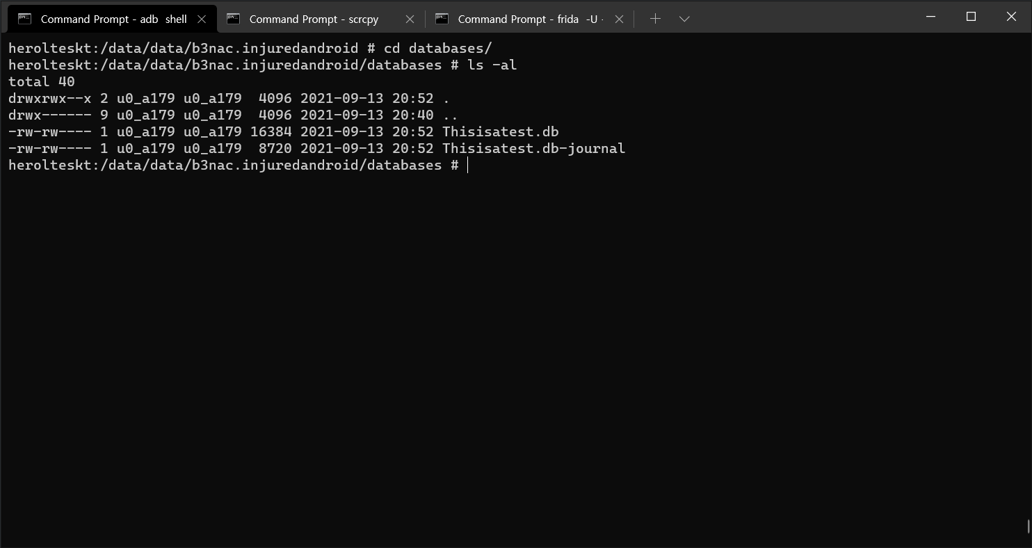 데이터 베이스는 /data/data/b3nac.injuredandroid/databases 에서 확인할 수 있다.