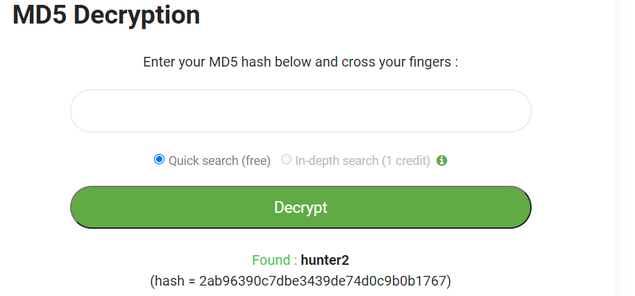 2ab96390c7dbe3439de74d0c9b0b1767 - MD5 Decrpytion ⇒ hunter2