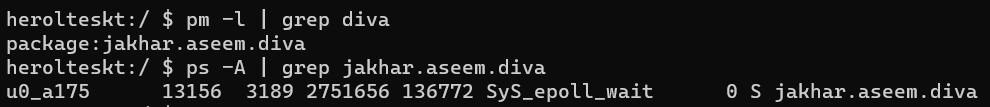 DivaJni 클래스에서 가져오고 있는 라이브러리를 확인하기 위해 먼저 해당 패키지의 pid를 확인한다.