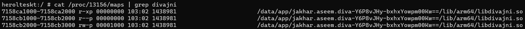 pid를 확인하였다면 /proc/[pid]/maps를 사용하여 프로세스의 메모리를 확인한다. 이때 그냥 사용하면 출력되는 라이브러리나 다양한 정보가 많기 때문에 이전 코드에서 확인한 "divajni"를 사용하여 관련된 라이브러리만 출력하도록 한다.