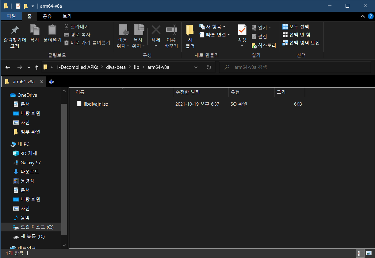 확인해보면 "/lib/arm64/libdivajni.so" 라이브러리를 사용하는 것을 알 수 있으므로 diva.apk를 압축 해제하여 해당 경로에 있는 라이브러리를 찾는다.
