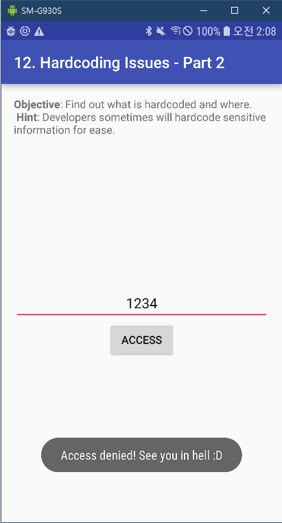 - onCreate()에서 생성한 DivaJni 클래스의 access() 함수에 인자로 사용자의 입력값을 넘겨준 후 반환 값에 따라 다음과 같은 동작을 한다.