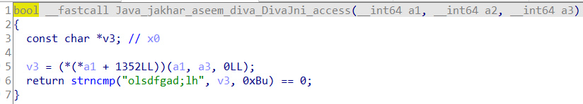 함수 목록을 확인해보면 "DivaJni_access"를 확인할 수 있는데 해당 함수를 눌러보면 다음과 같이 strncmp() 함수를 통해 비교하는 문자열이 하드 코딩되어 있는 것을 확인할 수 있다.