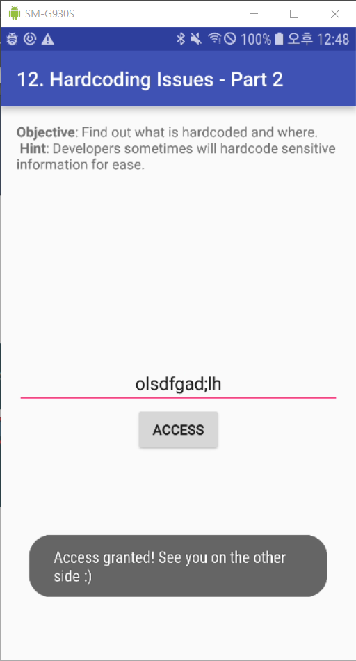 이후 발견한 하드코딩 문자열을 입력 후 ACCESS 버튼을 눌러주면 "Access granted! See you on the other side :)"라는 문자열이 출력되는 것을 확인할 수 있다.
