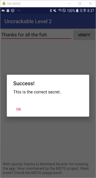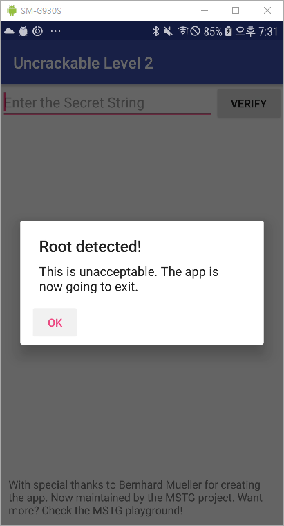 앱을 실행시키면 이전 Uncrackable 1과 똑같이 루팅 감지를 하고 OK 버튼을 누르면 종료되는 것을 확인할 수 있다.