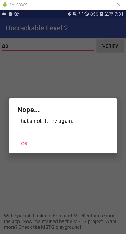 루팅 감지는 이전 단계와 똑같이 우회할 수 있으니 우회를 한 뒤 확인해보면 사용자 입력을 받을 수 있는 공간 하나와 VERFIY 버튼 하나로 구성되어 있음을 알 수 있다. 또한 이전과 똑같이 무작위 데이터 입력 후 버튼을 눌러보면 "Nope..."이라는 창을 확인할 수 있다.